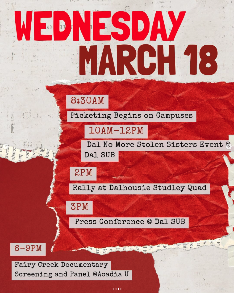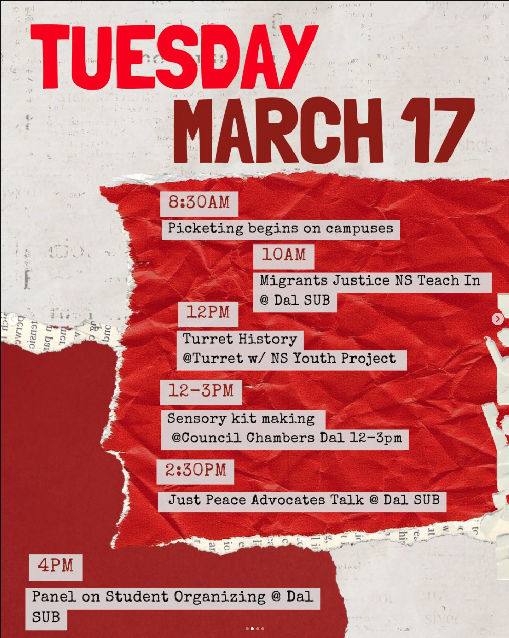 Emerging information on the strike week schedule is continuing to be developed by Nova Scotia Student Strike, as they are the organizers of these events, not the DSU directly. Please refer directly to their Instagram for programming and questions: @dalstudents4strike and @novascotiastudentstrike. As shared in the SGM, provincial strike programming will include: teach-ins, panels, rallies, art builds, performances and community meals.